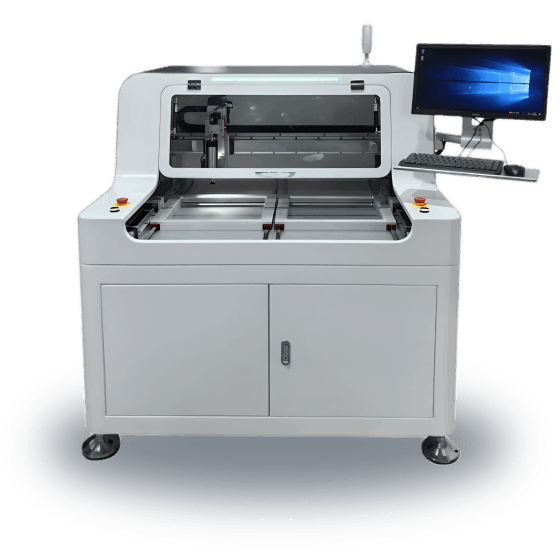 本設備主要利用銑刀高速運轉將多連片式PCB按預先編程路徑分割開來,取代人工折斷或V-CUT或PUSH的切割瑕疵,有效的降低分板時產生的應力,并且分板切割面光滑無毛刺